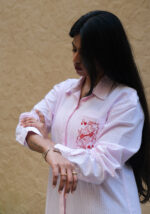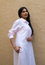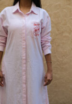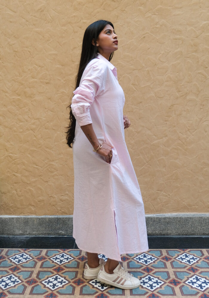 The ultimate blend of classic tailoring and playful detail. Crafted from premium Oxford Cotton, this shirt dress reimagines a timeless silhouette with a whimsical twist. Featuring a crisp pink stripe pattern, it offers a more structured, polished feel than our Muslin collection while maintaining the same “elevated everyday” philosophy.