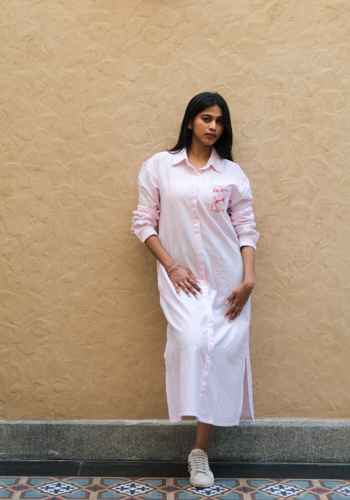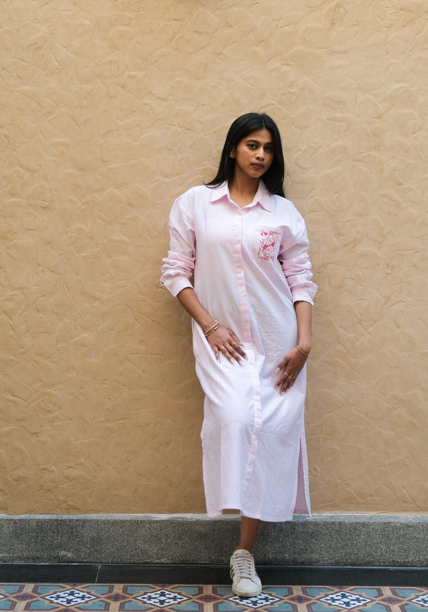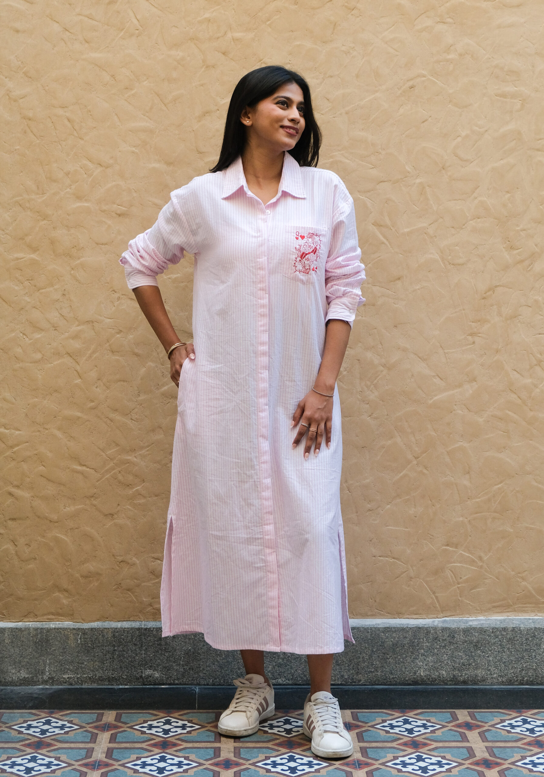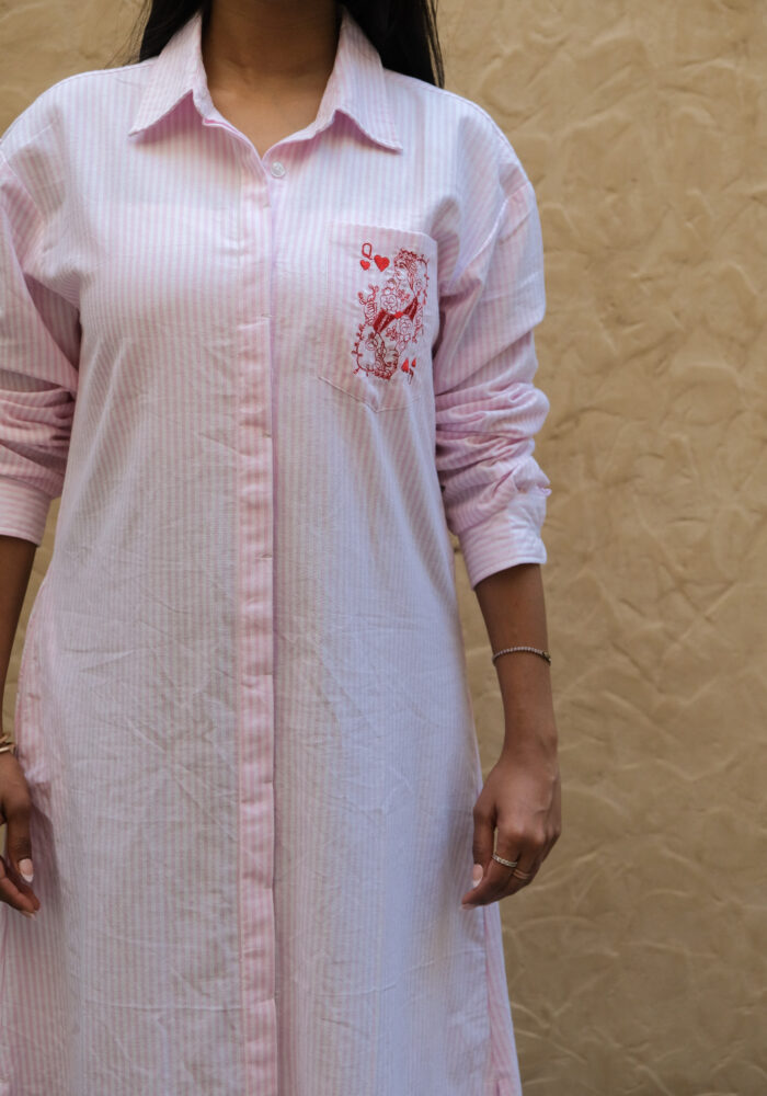 The Queen of Hearts Shirt Dress — Pink Stripe Oxford